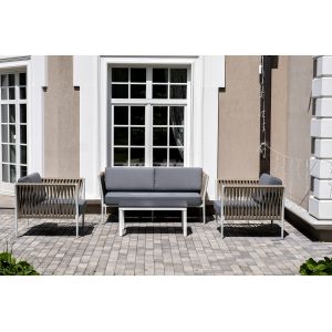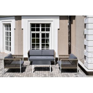 Комплект-трансформер садовой мебели 4SIS «Альпы» - ОписаниеТрансформирующаяся модульная лаунж-зона «Альпы». Преобразовывается в 6 различных модификаций. Облегченный алюминиевый каркас белого цвета, подушки с влагоотталкивающей пропиткой и съемными чехлами серого цвета. В состав комплекта входит: два прямоугольных модуля, которые трансформируются в шезлонги, один квадратный модуль с возможностью трансформации в три изделия (столик, оттоманка и кресло), семь съемных спинок.