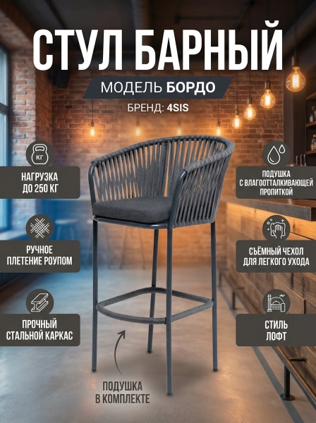 Стул барный 4SIS "Бордо" роуп серый, ткань темно-серая 027 - БрендСтрана бренда: Россия Премиальность бренда:Стул барный 4SIS "Бордо" роуп серый, ткань темно-серая 027 - Характеристики