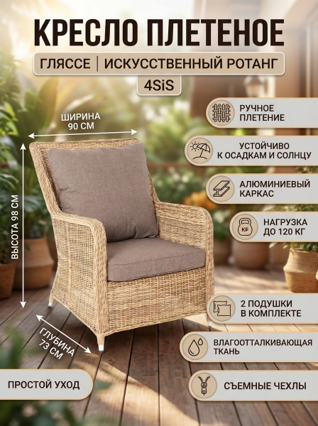 Кресло плетеное из искусственного ротанга 4SIS «Гляссе» - ОписаниеКресло из искусственного ротанга «Гляссе» станет прекрасным дополнением к месту отдыха. Кресло оснащено каркасом из прочного алюминия, а его оплетка выполнена из круглого ротанга ручного плетения. В комплектацию входят мягкие подушки из влагоотталкивающего полиэстера, плотностью 230гр/м2.