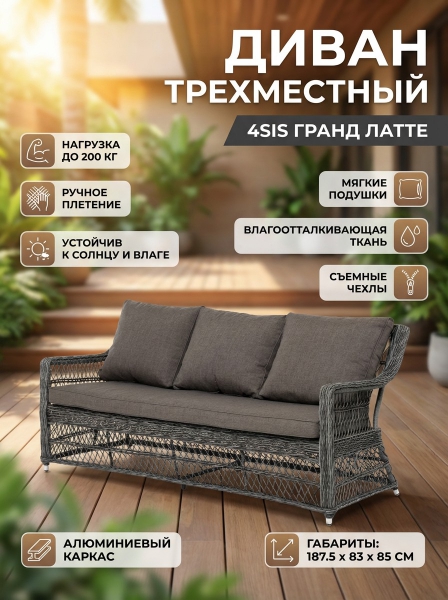 Диван трехместный из искусственного ротанга 4SIS «Гранд Латте» - ОписаниеДиван «Гранд Латте» рассчитан для размещения трех человек. Он имеет алюминиевый каркас, который выдерживает большой вес. Модель выполнена с помощью ручного круглого плетения из искусственного ротанга.