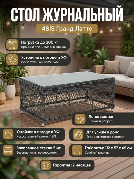 Стол журнальный из искусственного ротанга 4SIS «Гранд Латте» - ОписаниеЖурнальный столик «Гранд Латте» гармонично вписывается в зону отдыха, обустроенную на свежем воздухе.