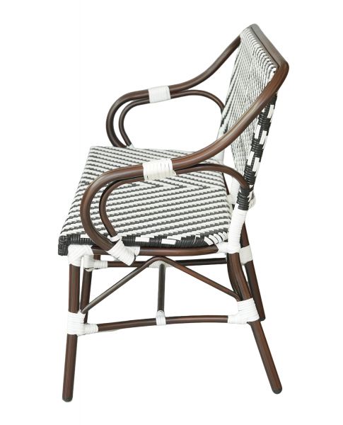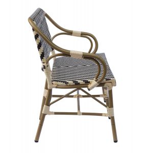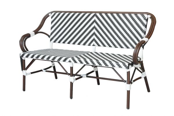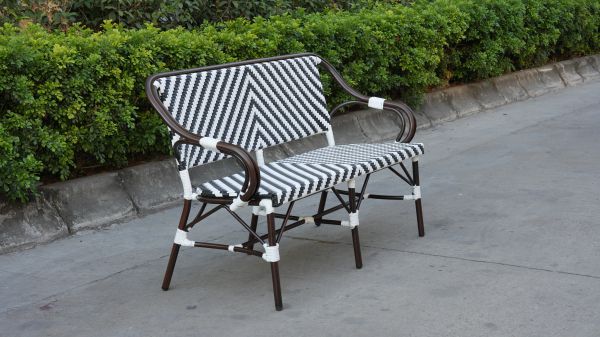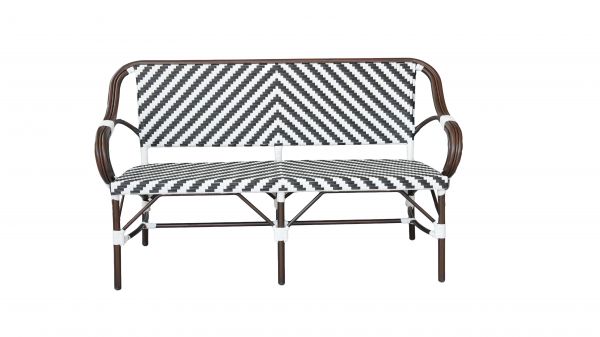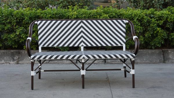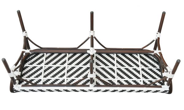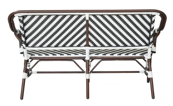 Каркас выполнен из алюминия, окрашенного износостойкой краской бронзовый оттенка. Конструкция имеет изогнутую трубчатую опору диаметром 28×1,5 мм. Плетение выполнено вручную из плоского искусственного ротанга 12×1,3 мм. Цвет оплетки - черно-белый. Широкая спинка стула позволяет комфортно расположиться, а сидение расслабиться. Диван легко очищается от загрязнений, удобен в эксплуатации. Ножки оснащены специальными заглушками, которые защищают их от влаги и улучшают устойчивость на неровной поверхности.