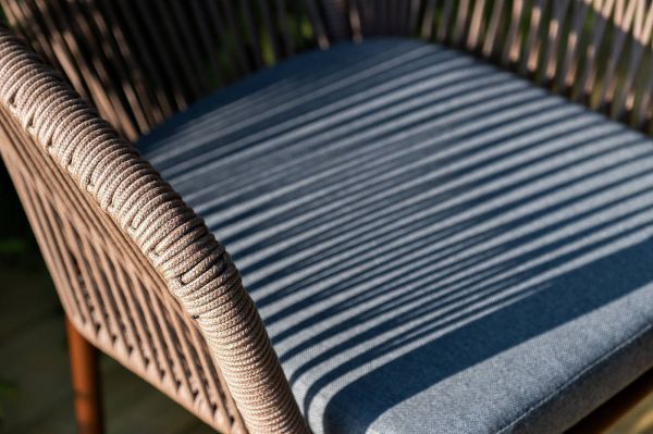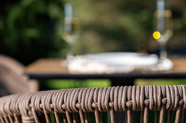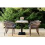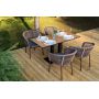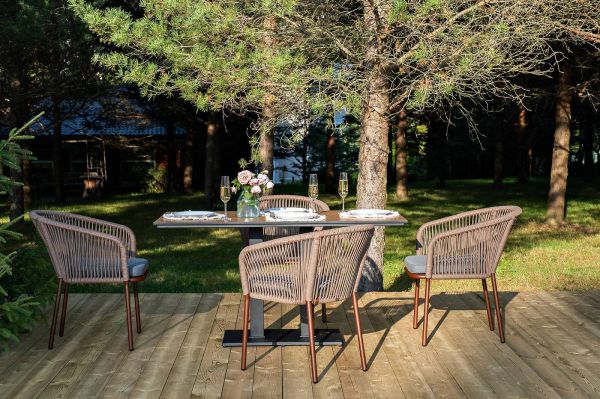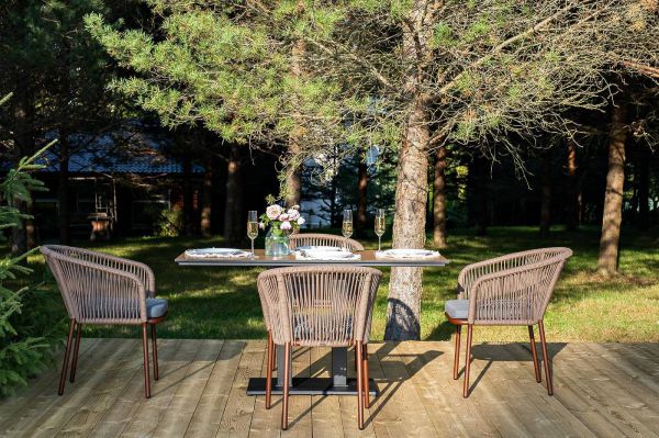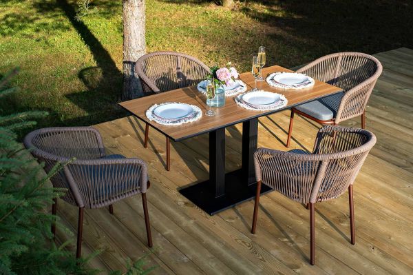 В состав комплекта входит: - Стол «Каффе» из HPL, размер столешницы - 140×70 см, цвет «дуб», подстолье двойное черное металл. - 4 плетеных стула «Марсель» из круглого роупа, размером - 570×620×775 мм, цвет каркас и роупа - коричневый.