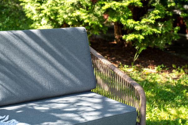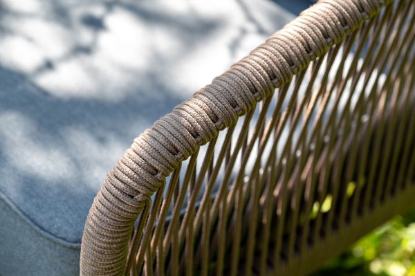 Каркас уличной мебели выполнен из прочного алюминия. Его дополняет коричневая оплетка, изготовленная на основе эластичных синтетических лент из полиэфирных волокон высокой прочности.
