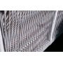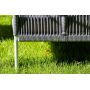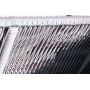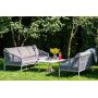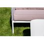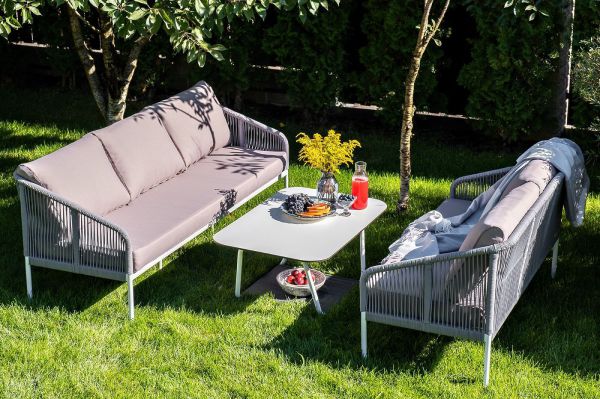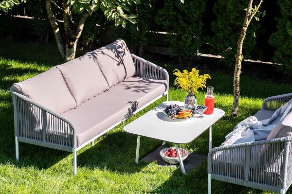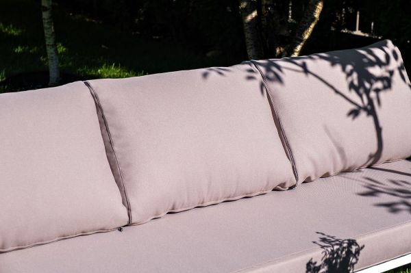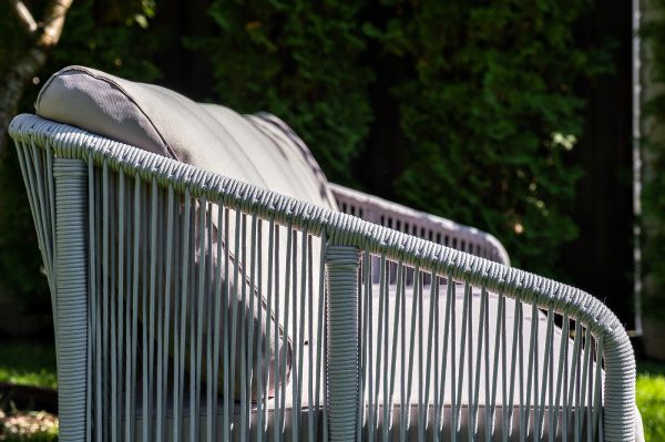 Диван имеет алюминиевый каркас, окрашенный порошковой краской в белый цвет. Боковины каркаса и спинка вручную оплетены роупом - эластичными синтетическими лентами, изготовленными из высокопрочных полиэфирных волокон. Цвет оплетки - светло-серый.