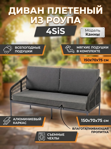 Диван 2-местный плетеный из роупа 4SIS «Канны» каркас алюминий темно-серый (RAL7024) муар - ОписаниеДвухместный плетеный диван "Канны" - это стильный и удобный элемент для отдыха на открытом воздухе или в помещении. Он изготовлен из качественного и прочного материала - роупа темно-серого цвета, обеспечивающий высокую стойкость к износу и долговечность изделия.
