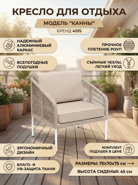 Кресло 4SIS "Канны" роуп бежевый круглый, ткань бежевая 052, пос.H45 - ОписаниеПлетеное кресло «Канны» идеально подходит для комфортного отдыха в саду или на балконе. Прочный каркас из алюминия окрашен в белый цвет порошковой износостойкой краской. Покрытие прочное, устойчивое к возникновению сколов и ржавчины. На боковинах - оплетка из синтетических лент, выполненных из полиэфирных волокон высокой прочности. Цвет плетения - бежевый. Приятное дополнение − подушки со съёмными чехлами аналогичного бежевого оттенка из влагоотталкивающей ткани, устойчивой к ультрафиолетовым лучам и неблагоприятным атмосферным воздействиям.