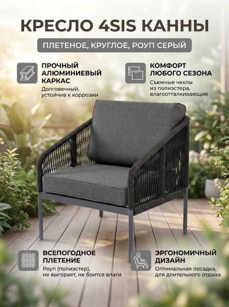 Кресло 4SIS "Канны" роуп серый круглый, ткань серая 017 - БрендСтрана бренда: Россия Премиальность бренда:Кресло 4SIS "Канны" роуп серый круглый, ткань серая 017 - Характеристики