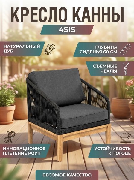 Кресло 4SIS "Канны", роуп темно-серый круглый, ткань темно-серая 027 - ОписаниеПлетеное кресло «Канны» идеально подходит для комфортного отдыха на открытом пространстве или в помещении.