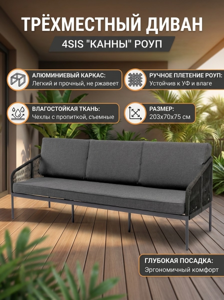 Диван 4SIS "Канны" трёхместный, роуп темно-серый круглый, ткань темно-серая 027 - БрендСтрана бренда: Россия Премиальность бренда:Диван 4SIS "Канны" трёхместный, роуп темно-серый круглый, ткань темно-серая 027 - Характеристики