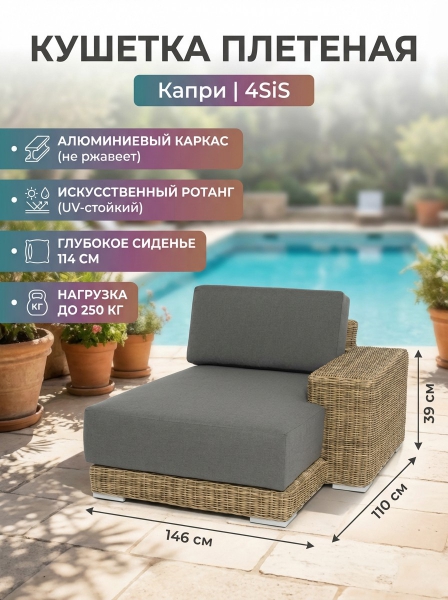 Кушетка 4SIS "Капри" из искусственного ротанга, цвет соломенный - Описание«Капри» плетеная кушетка из искусственного ротанга соломенного оттенка прекрасно дополнит пространство для отдыха на открытом воздухе. Кушетку можно использовать не только как самостоятельный элемент, но и быть частью лаунж-зоны, в которую данная модель превосходно интегрируется. В комплект входят подушки серого цвета.