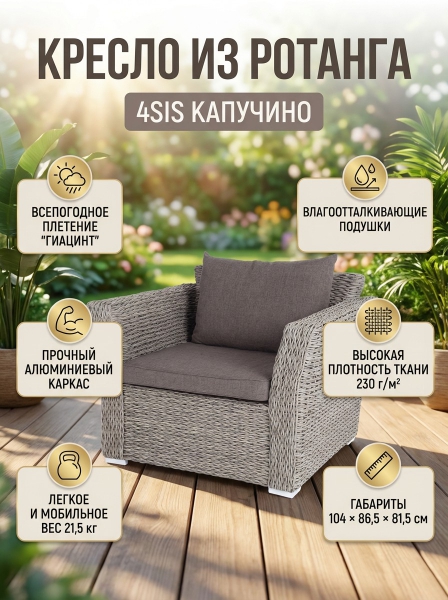 Кресло 4SIS "Капучино" из искусственного ротанга (гиацинт), серый - ОписаниеКресло из искусственного ротанга «Капучино» серого цвета, прекрасно подходит для обустройства веранды, а относительно небольшой вес, который составляет 21,5 кг, увеличивает мобильность данной модели. Плетение используется вида «гиацинт». Модель оснащена удобными подушками с влагоотталкивающей пропиткой.