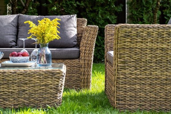 Из алюминия сделан устойчивый каркас мебели. Ее поверхность дополнена искусственным ротангом вида "гиацинт", из которого сделано ручное плетение.