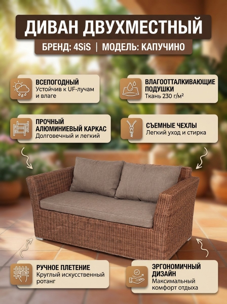 Диван из искусственного ротанга двухместный 4SIS «Капучино» - ОписаниеДиван «Капучино» двухместный с каркасом из прочного алюминия. Диван выполнен из круглого искусственного ротанга, оплетенного вручную.