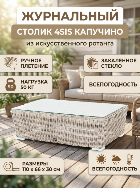 Журнальный столик из искусственного ротанга 4SIS «Капучино» - ОписаниеЖурнальный столик «Капучино» является хорошей парой к трехместному дивану, который представлен в этой мебельной коллекции.