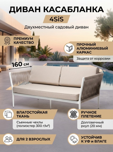 Диван 4SIS "Касабланка" двухместный, роуп бежевый 20мм, ткань бежевая 15052 - ОписаниеДвухместный диван «Касабланка» с подушками в комплекте. Диван имеет алюминиевый каркас, окрашенный порошковой краской в белый цвет. Боковины каркаса вручную оплетены роупом - эластичными синтетическими лентами, изготовленными из высокопрочных полиэфирных волокон. Цвет оплетки - бежевый. Подушки со съёмными чехлами, которые обработаны влагоотталивающей пропиткой. Материал - 100% полиэстер, плотностью 300гр/м2.