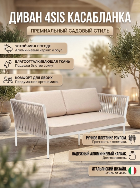 Диван 4SIS "Касабланка" двухместный, роуп серо-коричневый 23мм, ткань бежевая 052 - ОписаниеДвухместный диван «Касабланка» с подушками в комплекте. Диван имеет алюминиевый каркас, окрашенный порошковой краской в светло-серый (RAL7035) цвет. Боковины каркаса вручную оплетены роупом - эластичными синтетическими лентами, изготовленными из высокопрочных полиэфирных волокон. Цвет оплетки - серо-коричневый. Подушки со съёмными чехлами, которые обработаны влагоотталкивающей пропиткой.