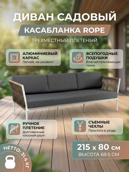 Диван 3-местный плетеный из роупа 4SIS «Касабланка» каркас алюминий светло-серый (RAL7035) муар - ОписаниеТрехместный диван "Касабланка" с подушками в комплекте.