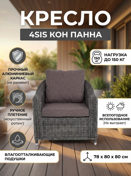 Кресло из искусственного ротанга 4SIS «Кон Панна» - ОписаниеКресло «Кон Панна» входит в лаунж-зону, состоящую из двухместного дивана, двух кресел и журнального столика. Но также может использоваться в качестве отдельного предмета. В качестве основы служит алюминиевый каркас, который оплетен круглым искусственным ротангом.