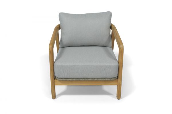 Каркас выполнен из тика — благородной древесины, известной своей прочностью, устойчивостью к внешним воздействиям и изысканной текстурой. Тёплый древесный оттенок подчёркивает природную эстетику мебели.