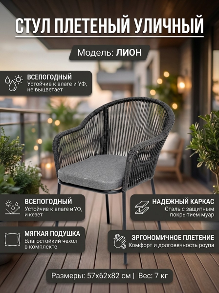 Подушка в комплекте со стулом выполнена из полиэстера 100% плотностью 300гр/м2 с влагоотталкивающей пропиткой. Это надежный и прочный материал, который легко очищается и устойчив к неблагоприятным погодным условиям.