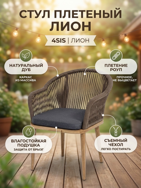 Стул 4SIS "Лион", роуп коричневый круглый, ткань темно-серая 027 - ОписаниеПлетеный стул «Лион» представляет собой удобное и стильное решение для дома или сада.