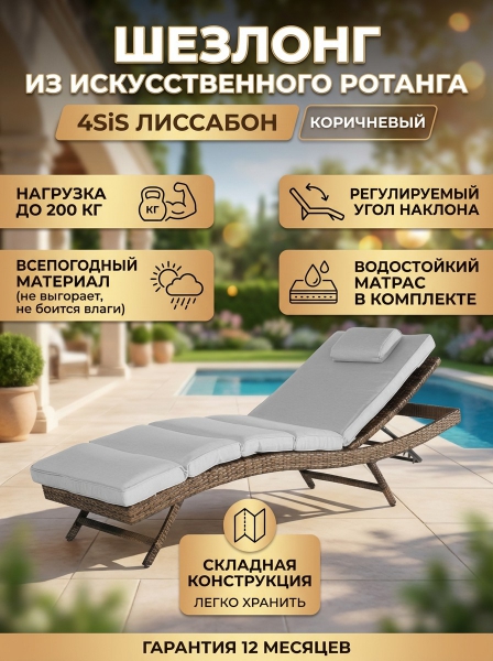 Шезлонг из искусственного ротанга 4SIS «Лиссабон» - Описание«Лиссабон» - стильный шезлонг из искусственного ротанга. Комфортная раскладная конструкция позволяет располагать спинку в разных положениях, что дает возможность отдохнуть в удобной позе. Шезлонг не занимает много места.