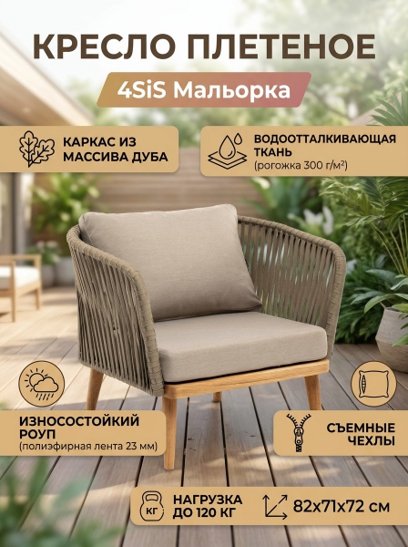 Кресло плетеное из роупа 4SIS Мальорка - ОписаниеПлетеное кресло «Мальорка» идеально подходит для комфортного отдыха в саду или на балконе. На боковинах - оплетка из синтетических лент, выполненных из полиэфирных волокон высокой прочности. Цвет плетения - серо-коричневый. Тип ткани - рогожка. Основание - дуб. Приятное дополнение − подушки со съёмными чехлами бежевого оттенка.