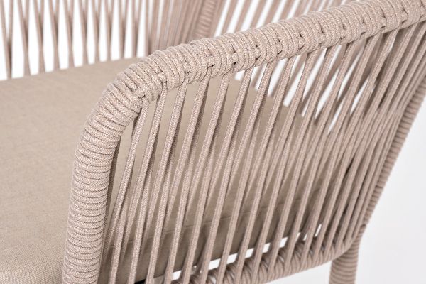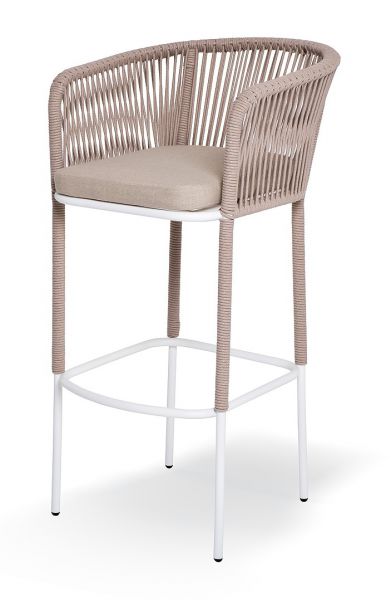 Стул барный 4SIS Марсель плетеный из роупа, каркас из стали белый муар - ОписаниеБарный стул «Марсель» представлен в стальном каркасе белого (RAL9016) цвета, оплетен вручную эластичными синтетическими лентами из высокопрочных полиэфирных волокон, бежевого оттенка, размер стула: 590×690×1100 мм. Высота сидения без подушки – 760 мм.