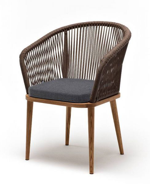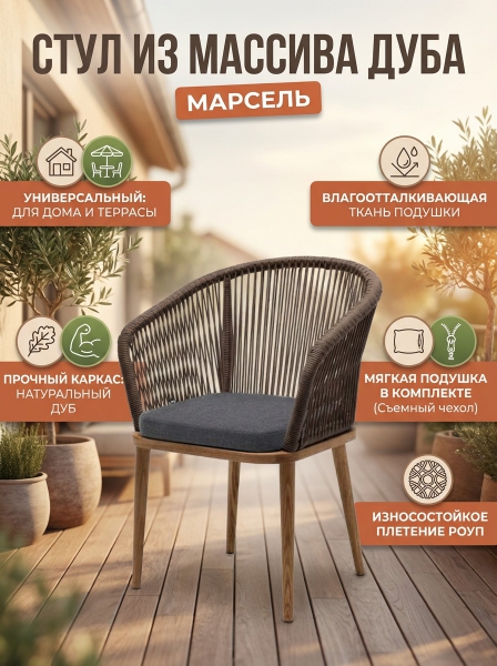 Стул 4SIS "Марсель" роуп коричневый круглый, ткань темно-серая 027 - ОписаниеСтул «Марсель» предназначен для организации обеденной зоны или зону лаунж. Каркас выполнен из натурального дерева. Оплетка выполнена вручную современным материалом - роупом. Это эластичные синтетические веревки из высокопрочных полиэфирных волокон, предназначенные для изготовления мебели. Цвет оплетки - коричневый. В комплекте одна подушка со съёмным чехлом с влагоотталкивающей пропиткой темно-серого цвета. Чехол можно стирать в стиральной машине с использованием порошков.