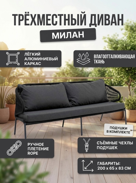 Диван 4SIS "Милан" трёхместный, роуп темно-серый круглый, ткань темно-серая 027 - ОписаниеТрехместный диван «Милан» с подушками в комплекте. Диван имеет алюминиевый каркас, окрашенный порошковой краской в темно-серый (RAL7024) цвет. Боковины каркаса и спинка вручную оплетены роупом - эластичными синтетическими лентами, изготовленными из высокопрочных полиэфирных волокон. Цвет оплетки – темно-серый. Подушки состоят из наполнителя и съёмных чехлов, которые обработаны влагоотталкивающей пропиткой темно-серого цвета.