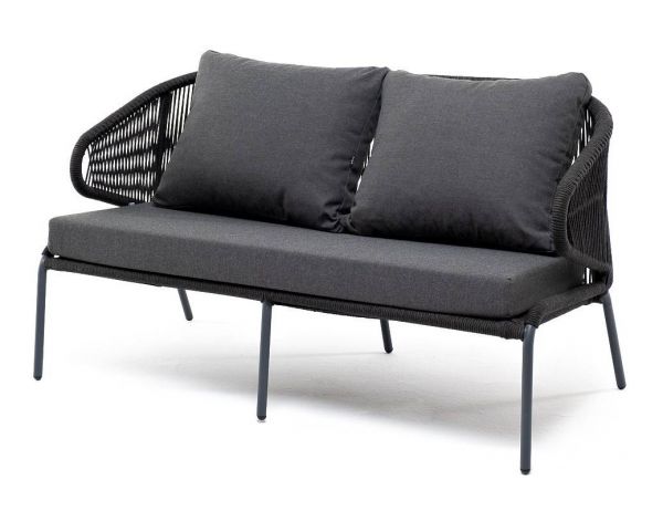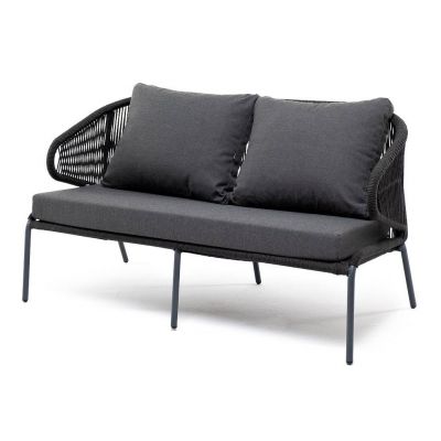 Диван 4SIS "Милан" двухместный, роуп темно-серый круглый, ткань темно-серая 027 - ОписаниеДвухместный диван «Милан» с подушками в комплекте. Диван имеет алюминиевый каркас, окрашенный порошковой краской в темно-серый (RAL7024) цвет. Боковины каркаса и спинка вручную оплетены роупом - эластичными синтетическими лентами, изготовленными из высокопрочных полиэфирных волокон. Цвет оплетки – темно-серый. Подушки состоят из наполнителя и съёмных чехлов, которые обработаны влагоотталкивающей пропиткой темно-серого цвета.
