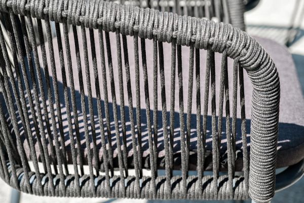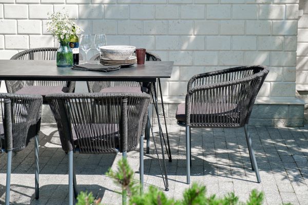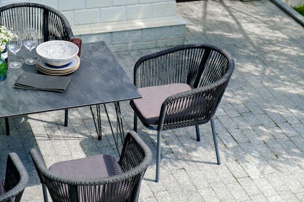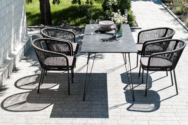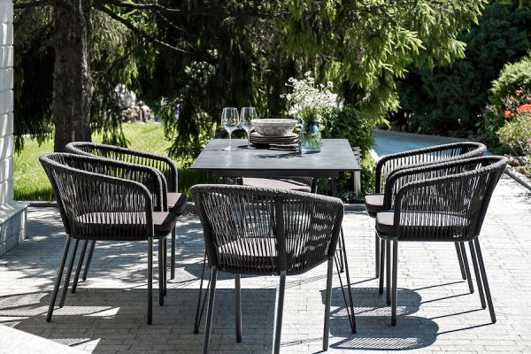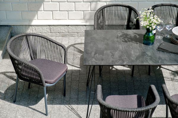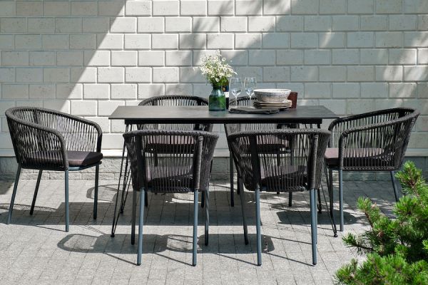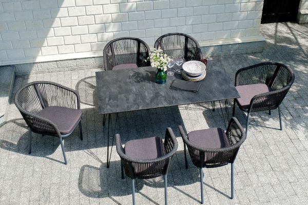 Обеденная группа на 6 персон 4SIS Милан - ОписаниеКомплект «Милан» для обустройства обеденной зоны, рассчитан на 6 персон. Столешница стола выполнена из высококачественного монолитного компакт-пластика HPL. Его толщина - 12 мм, цвет - «черный мрамор», ножки - из металла. Каркас стульев - алюминиевый, оплетен вручную современным материалом - роупом. Это эластичные синтетические ленты из высокопрочных полиэфирных волокон. В комплект входят подушки со съёмными водоотталкивающими чехлами серого цвета.
