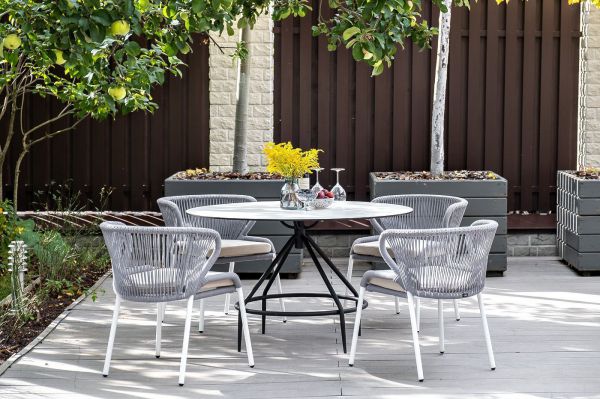 Плетеный стул из роупа (веревки) 4SIS «Милан» подушка ASH - ОписаниеСтул "Милан" для обустройства обеденной или лаунж-зоны. Изготовлен из алюминиевого каркаса, оплетенного вручную эластичными синтетическими лентами из высокопрочных полиэфирных волокон (роуп круглый). Цвет каркаса - белый, оплетки - светло-серый.
