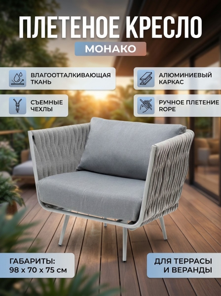 Кресло плетеное из роупа 4SIS «Монако» каркас алюминий светло-серый (RAL7035) муар - ОписаниеПлетеное кресло "Монако" для обустройства обеденной или лаунж-зоны. Изготовлен из алюминиевого каркаса, оплетенного вручную эластичными синтетическими лентами из высокопрочных полиэфирных волокон. Цвет каркаса и оплетки – светло-серый.