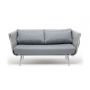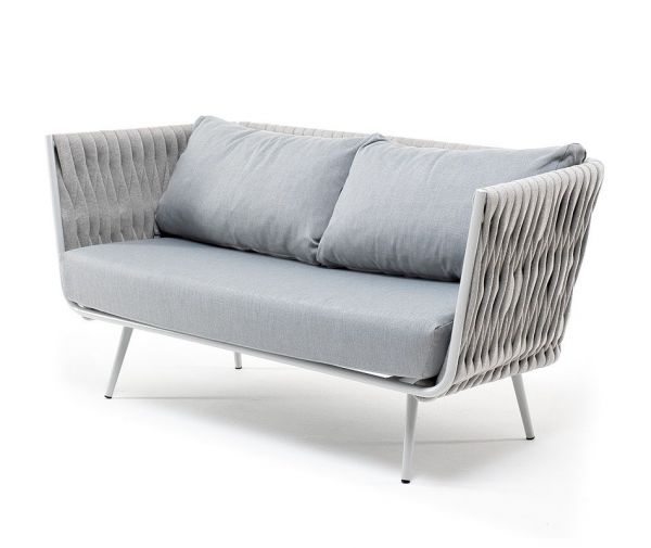 Диван имеет алюминиевый каркас, окрашенный порошковой краской в светло-серый цвет. Боковины каркаса и спинка вручную оплетены роупом - эластичными синтетическими лентами, изготовленными из высокопрочных полиэфирных волокон. Цвет оплетки - светло-серый.