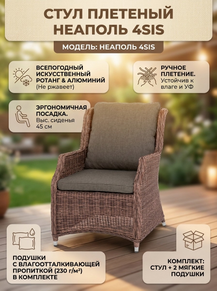 Стул 4SIS "Неаполь" из искусственного ротанга, цвет коричневый - ОписаниеСтул «Неаполь» имеет практичные подлокотники для удобного размещения во время отдыха. Спинка и подлокотники имеют плавные линии, благодаря своим закругленным формам. Каркас мебели сделан из алюминия. Присутствует ручное круглое плетение, при изготовлении которого используется искусственный ротанг. Представлено в коричневом цвете. Плетенный стул дополняют мягкие подушки. Они выполнены в серо-коричневом оттенке. Пошиты изделия из плотного полиэстера 230гр/м2. Ткань предварительно обрабатывается влагоотталкивающей пропиткой.