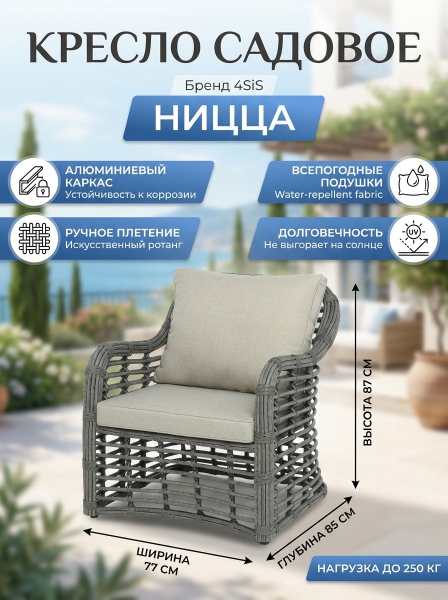 Кресло 4SIS "Ницца" из искусственного ротанга, цвет серый - ОписаниеКресло «Ницца» предназначено для комфортного времяпровождения в зоне отдыха с диванами и столиком из этой же серии. Каркас мебели сделан из прочного алюминия с высокими эксплуатационными качествами. Оплетен вручную с помощью круглого искусственного ротанга. Представлено в сером оттенке. Садовое кресло укомплектовано удобными бежевыми подушками. Полиэстер используется при пошиве тканевых изделий, плотность которого - 300гр/м2. Материал имеет обязательную влагоотталкивающую пропитку для усиления его защитных свойств.