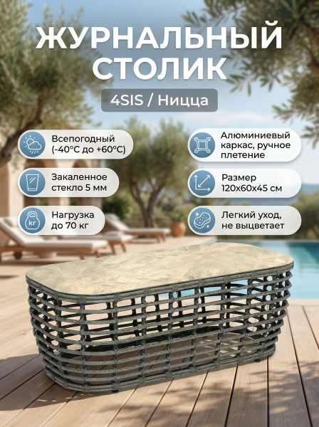 Журнальный столик 4SIS "Ницца" ротанг серый - ОписаниеЖурнальный столик «Ницца» используется как в комплекте, так и в качестве отдельного предмета для сада, открытой террасы или балкона. Каркас столика изготовлен из алюминия, вручную оплетенного круглым искусственным ротангом. Столешница из закаленного стекла толщиной 5 мм. Благодаря износостойким материалам, стол пригоден для использования на улице при любой погоде и не требует специальных условий хранения. Плетеный столик представлен в сером цвете.