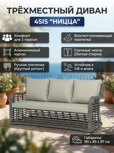 Диван 4SIS "Ницца" трёхместный, ротанг серый - ОписаниеДиван «Ницца» подходит для размещения сразу трех персон. Его основа из прочного алюминиевого каркаса. Ручное круглое плетение является основным декоративным элементом мебели. Оно выполнено из искусственного ротанга в сером цвете. В комплекте с трехместным диваном идут мягкие подушки для комфортного расположения. Чехлы съёмные бежевого цвета из высококлассного полиэстера с плотностью 300гр/м2. Защитные свойства ткани усиливаются при помощи влагоотталкивающей пропитки.
