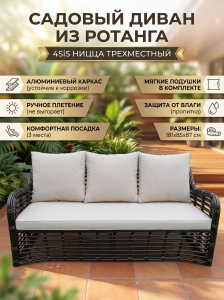 Диван из искусственного ротанга трехместный 4SIS «Ницца» - ОписаниеДиван "Ницца" подходит для размещения сразу трех персон. Его основа из прочного алюминиевого каркаса.