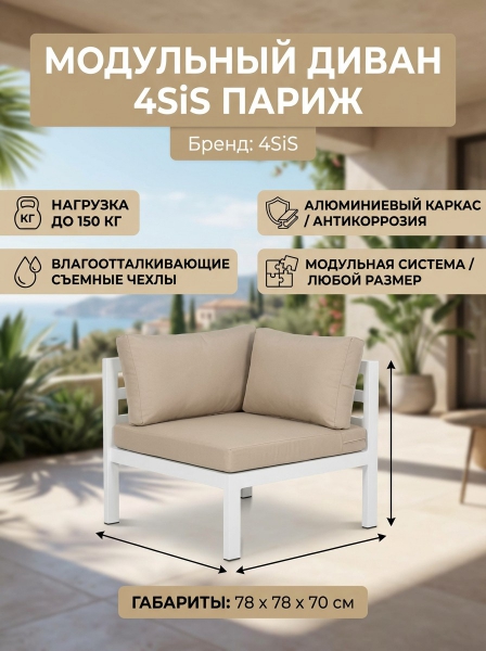 Модуль диванный алюминиевый угловой 4SIS «Париж» - ОписаниеМодуль диванный угловой «Париж». Каркас алюминиевый белого цвета. В комплекте подушки бежевого цвета со съемными чехлами.