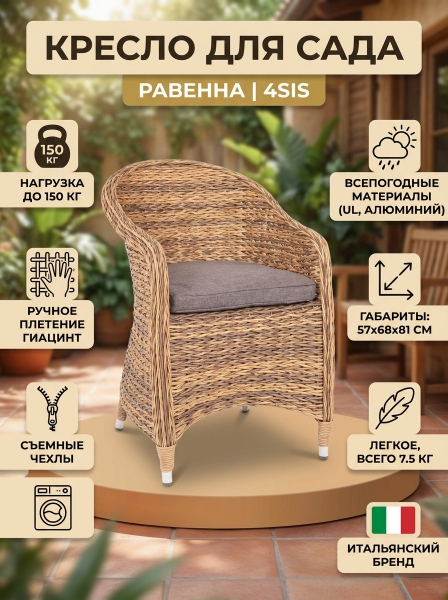 Кресло из искусственного ротанга (гиацинт) 4SIS «Равенна» - ОписаниеКресло для сада из искусственного ротанга c плетением вида "гиацинт" из коллекции «Равенна» станет поистине украшением вашего сада, веранды или террасы. Его можно использовать в помещении и на улице. Кресло изготовлено посредством ручного плетения. Для укрепления конструкции использован алюминиевый каркас. Благодаря ему плетеное кресло остается легким, но прочным. Модель способна выдержать до 150 кг. В комплект включена серая подушка со съемным чехлом из полиэстера, который обработан влагоотталкивающими пропитками. Чехол можно стирать.
