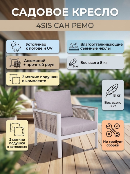 Садовое кресло плетеное из роупа 4SIS «Сан Ремо» - ОписаниеКресло «Сан Ремо» можно использовать на открытой веранде, дачном участке или у бассейна. Данное кресло входит в комплект аналогичной лаунж-зоны. Каркас выполнен из высококачественного алюминия и окрашен порошковой краской в белый цвет. Боковые стороны подлокотников вручную оплетены эластичными синтетическими лентами, состоящие из высокопрочных полиэфирных волокон.