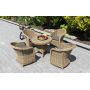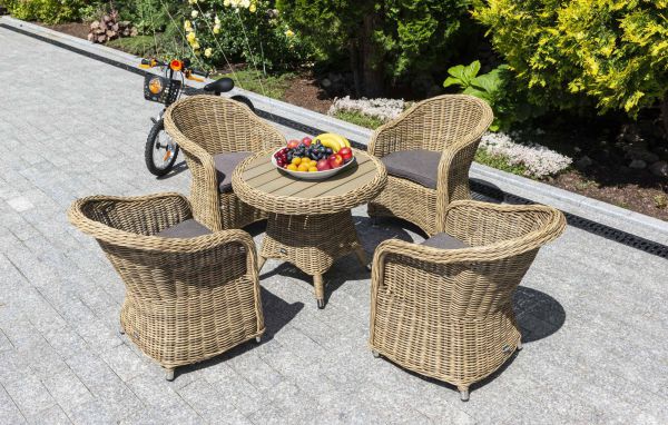 Каркас изготовлен из легкого алюминия, благодаря чему перемещать мебель сможет даже ребенок. В качестве декоративной оплетки использован искусственный ротанг, устойчивый к механическим повреждениях, ультрафиолету, атмосферным осадкам. Столешница изготовлена из долговечного композитного материала ДПК. Стулья укомплектованы подушками из влагостойкой полиэфирной ткани.
