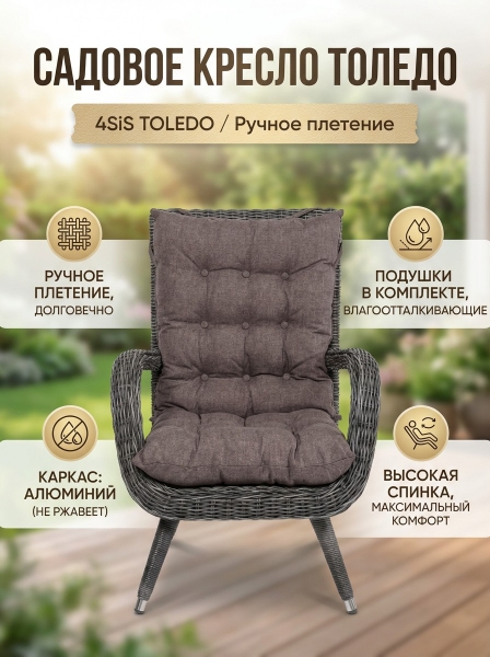 Садовое кресло плетеное с подушками 4SIS «Толедо» - ОписаниеКресло «Толедо» имеет высокую спинку и удобные закругленные подлокотники. При использовании в ресторанах такая конструкция не требует дополнительного зонирования пространства. При изготовлении ее каркаса используется прочный алюминий с высокой износостойкостью. Имеет ручное плетение, которое выполнено из искусственного ротанга.