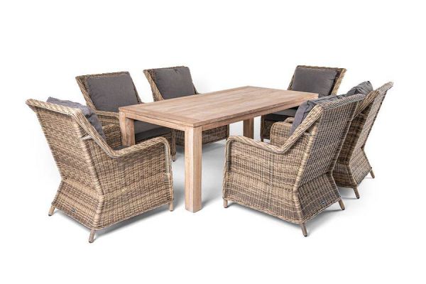 В ее составе: - стол «Витория» – 2000×1000×770 мм - 6 плетеных кресел «Гляссе» – 900×730×980 мм