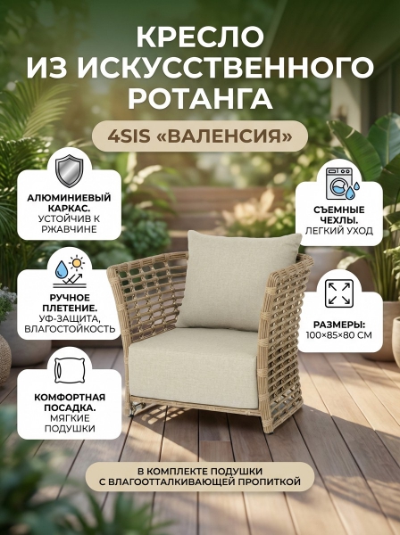 Кресло из искусственного ротанга 4SIS "Валенсия", цвет соломенный - ОписаниеКресло из искусственного ротанга «Валенсия» станет прекрасным дополнением к месту отдыха. Кресло оснащено каркасом из прочного алюминия, ручное круглое плетение является основным декоративным элементом мебели. Оно выполнено из искусственного ротанга в соломенном цвете. В комплектацию входят мягкие подушки для комфортного расположения. Чехлы съёмные бежевого цвета из высококлассного полиэстера с плотностью 300гр/м2.