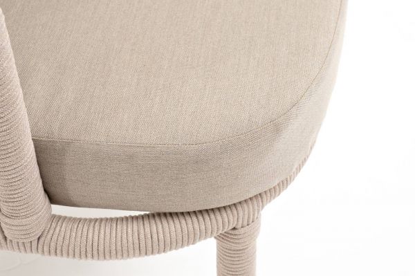 Кресло 4SIS "Верона" роуп бежевый круглый, ткань бежевая 052 - ОписаниеПлетеное кресло «Верона» с подушками в комплекте. Кресло имеет алюминиевый каркас, окрашенный порошковой краской в белый цвет. Боковины каркаса вручную оплетены роупом - эластичными синтетическими лентами, изготовленными из высокопрочных полиэфирных волокон. Цвет оплетки - бежевый. На ножках кресла идут дубовые наконечники (заглушки). Подушки со съёмными чехлами, которые обработаны влагоотталивающей пропиткой. Материал - 100% полиэстер, плотностью 300гр/м2.