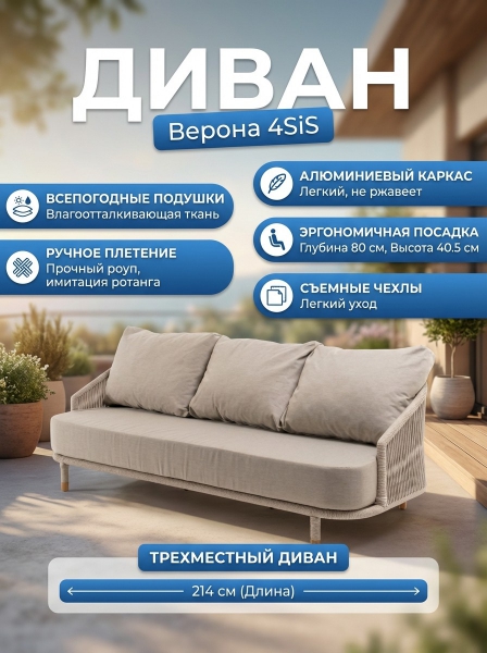 Диван 4SIS "Верона" трёхместный, роуп бежевый круглый, ткань бежевая 15052 - ОписаниеТрехместный диван «Верона» с подушками в комплекте.